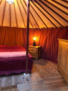 La Yourte est équipée d'un lit double, de table de chevets, d'un meuble de rangement et d'une table avec deux chaises.